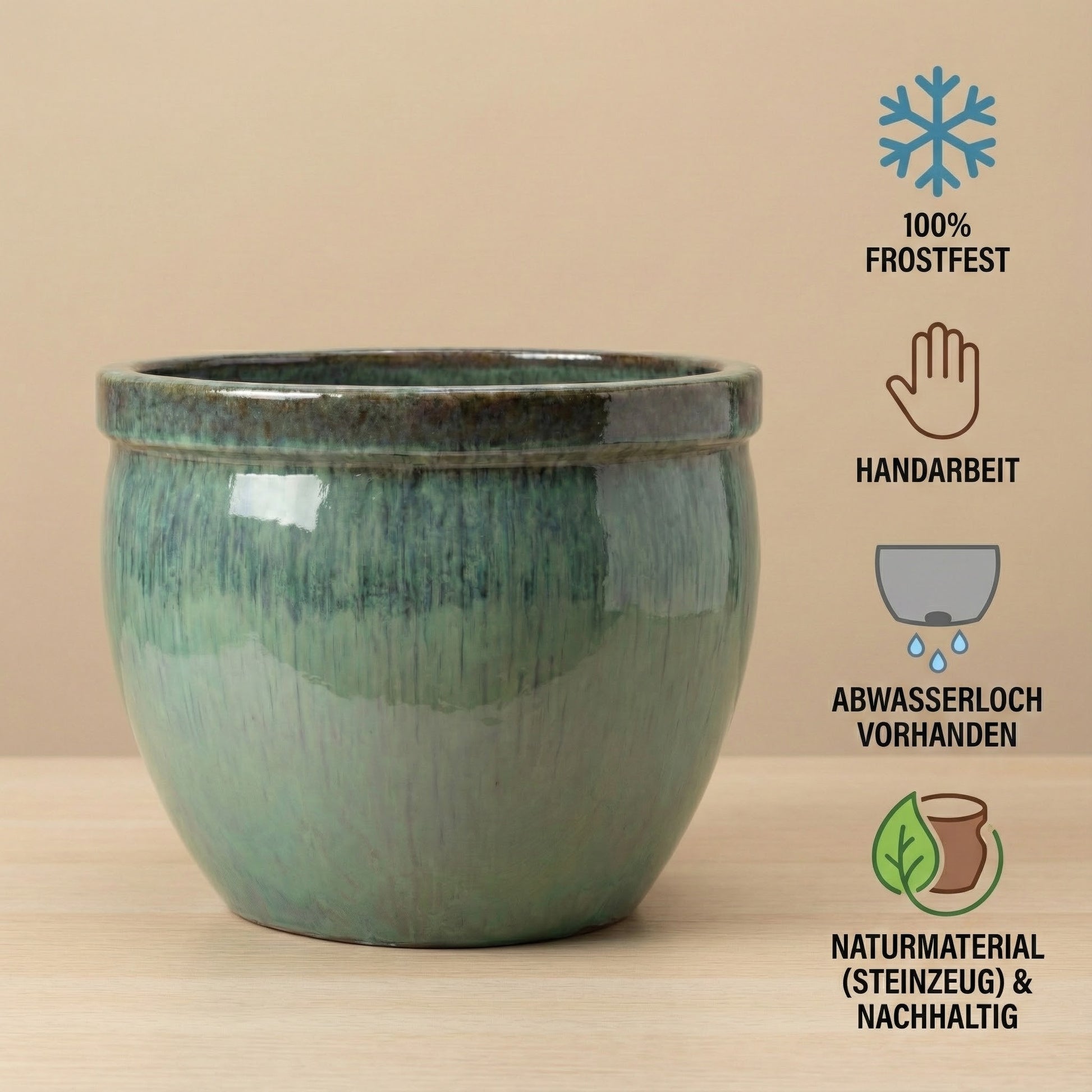 👉 Wir empfehlen: Füllen Sie unten eine Drainageschicht (Blähton) ein und stellen Sie den Topf im Winter auf Keramik-Füße, damit er nicht am Boden festfriert.