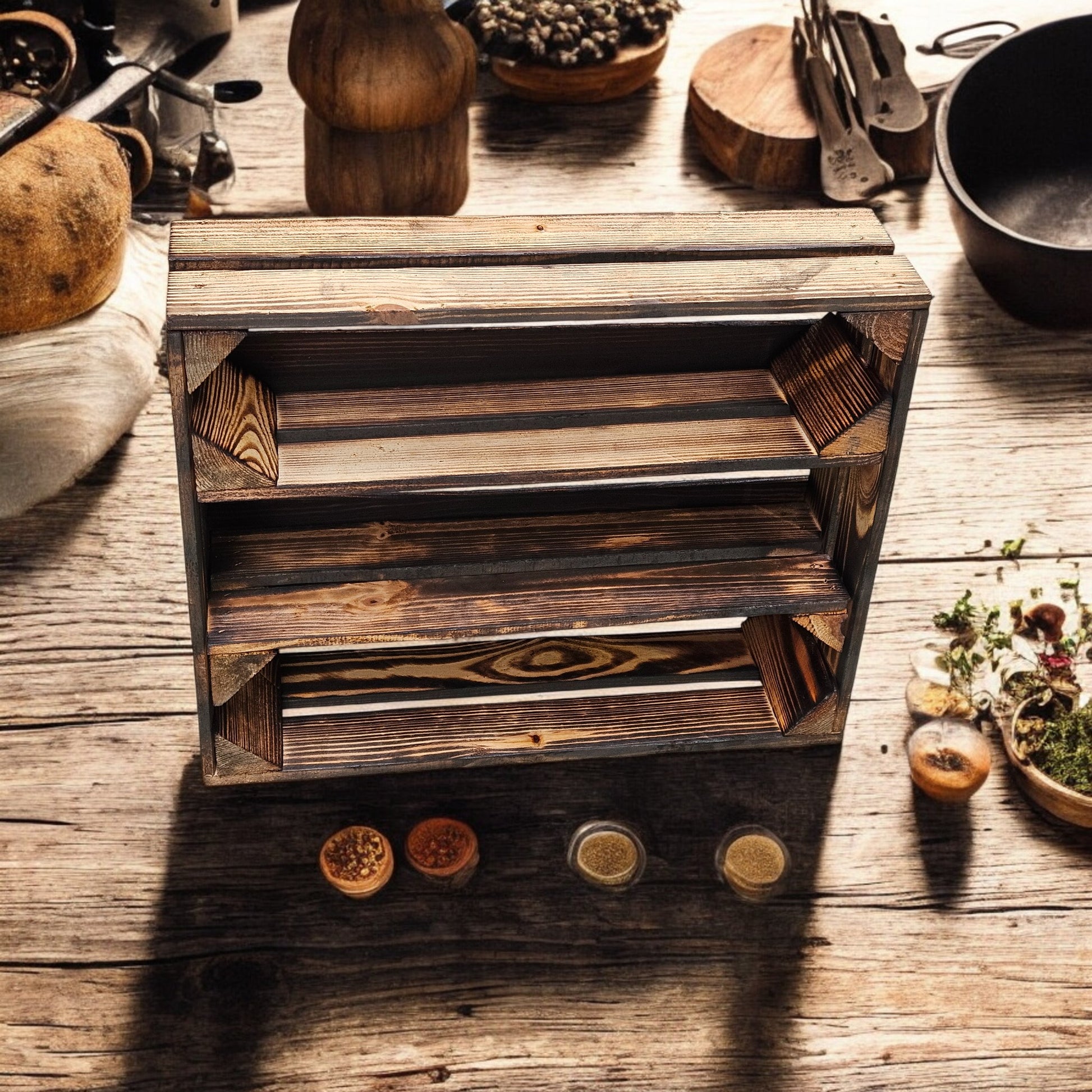 Rustikales Gewürzregal mit 2 Längsböden – 50 × 40 × 15 cm, geflammte Optik