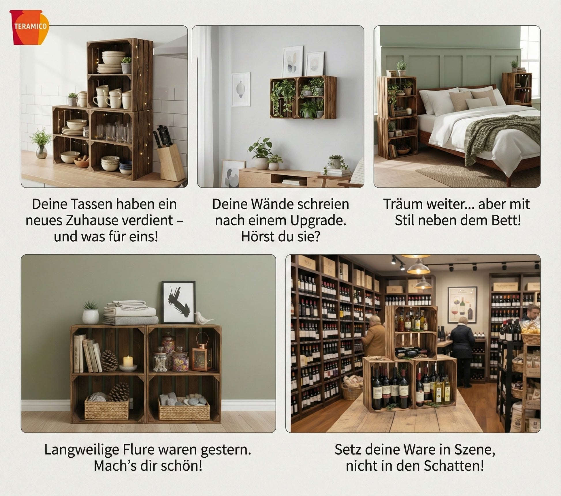 • Massive Bauweise: Wir verwenden ca. 10mm starkes Nadelholz (neu & gehobelt). Die Kisten sind stapelbar und extrem kippsicher – perfekt für große Regalwände.
