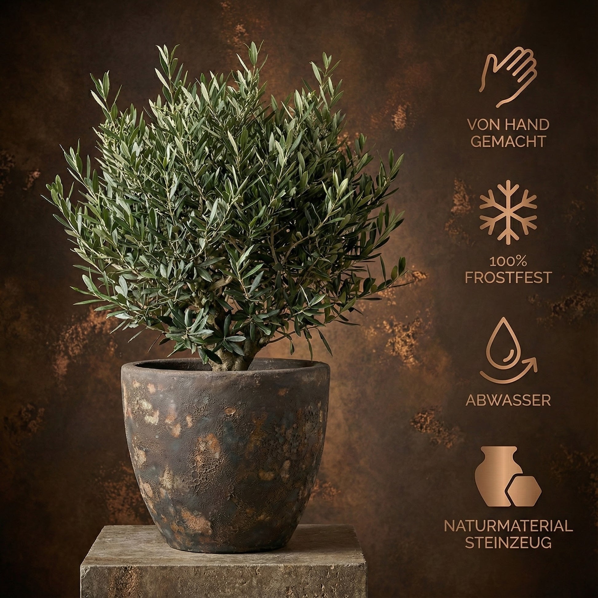 Die bauchige Form und die erdige Oberfläche passen perfekt zum Landhaus-Stil, Industrial-Look oder als ruhiger Gegenpol in modernen Wohnungen. Das Grün der Pflanzen wirkt vor dem braunen Hintergrund besonders satt.