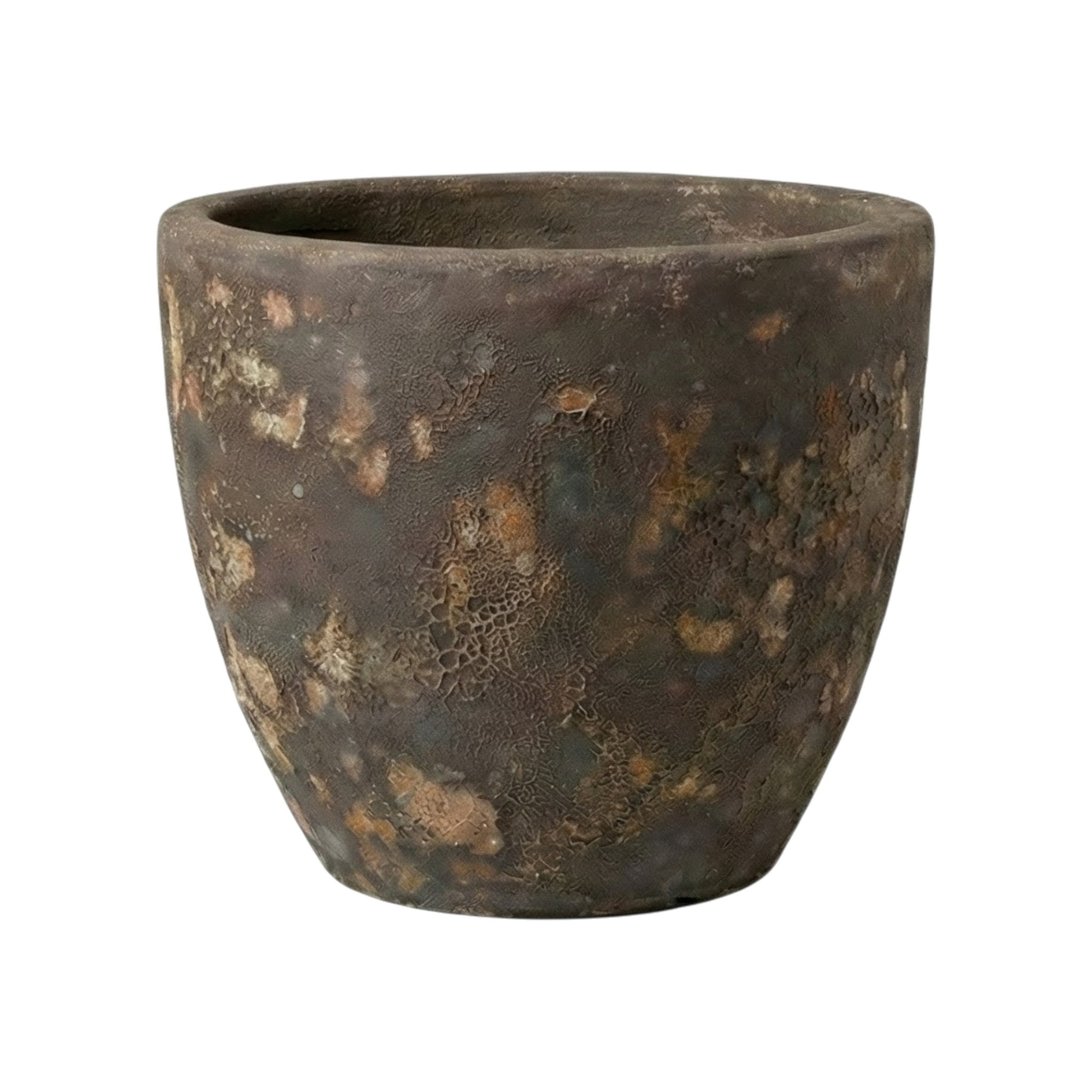 Natürlichkeit im Wohnraum: Das Modell "Egg Pot Lava" in Braun (mittlere Größe, 29 cm) bringt Wärme und rustikalen Charme in Ihr Zuhause. Die Besonderheit liegt in der geschliffenen Struktur. Die Oberfläche ist haptisch erlebbar – rau, uneben und lebendig. Die Farbe ist ein Mix aus warmen Erdtönen, durchzogen von dunklen und rostigen Spuren, die durch den Schliff zum Vorschein kommen.