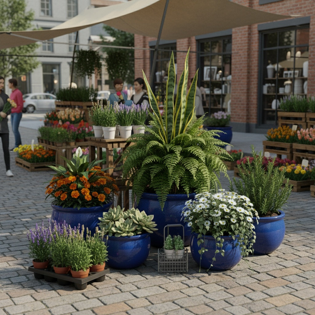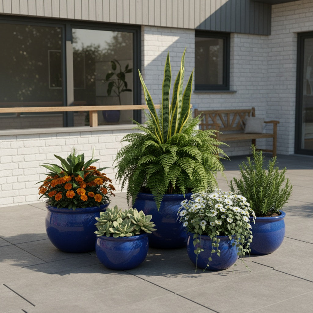 Diese Größe ist aufgrund ihrer Würde und Ruhe sehr beliebt für die Grabgestaltung. Blau symbolisiert Treue und Beständigkeit. Die Schale ist schwer genug, um Stürmen zu trotzen, und bietet genug Volumen für eine dauerhafte Bepflanzung mit Heide oder Silberblatt.