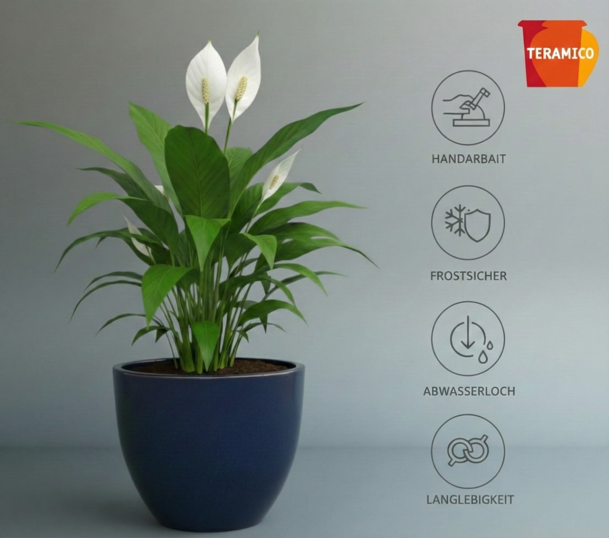 Die dunkelgraue Glasur ist schlicht und elegant. Sie lässt das Grün der Pflanzen strahlen und ist absolut unempfindlich gegenüber Schmutz. Da die Töpfe aus massivem Steinzeug hochgebrannt werden, sind sie zu 100% winterhart.