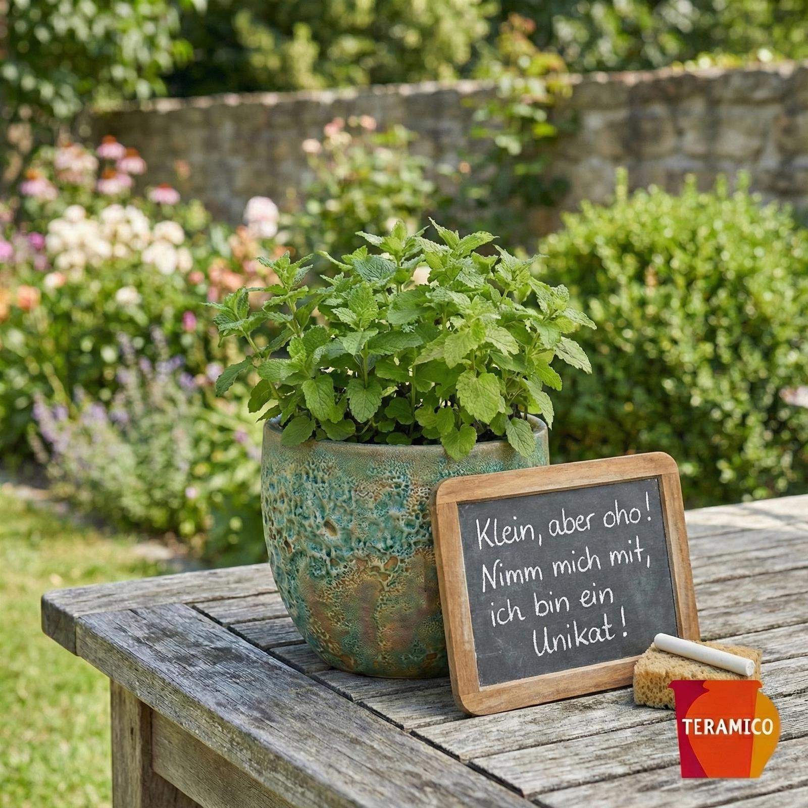 Perfekt für die Küche oder den Gartentisch. Besonders schön mit Basilikum, Thymian oder kleinen Farnen, die das Grün des Topfes aufgreifen.