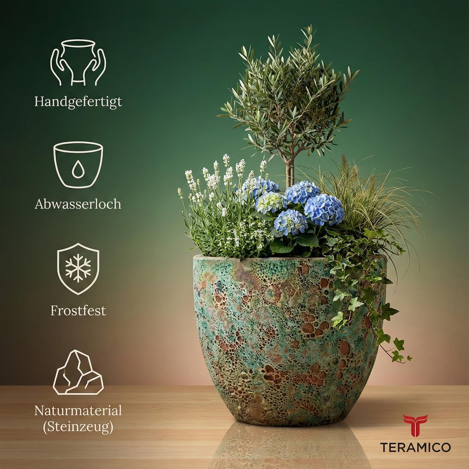 • 100% Winterhart: Das Steinzeug ist dicht gebrannt. Bei freiem Wasserablauf kann der Topf das ganze Jahr draußen stehen.