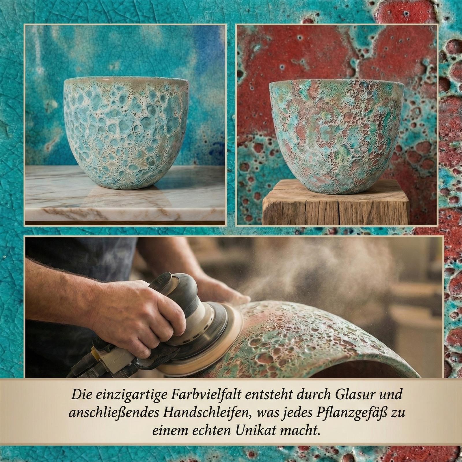Die Farbe ist ein lebendiges, natürliches Grün. Durch den manuellen Schliff ("Lava Struktur") entstehen hellere und dunklere Nuancen sowie raue Stellen. Kein Topf gleicht dem anderen – Sie erhalten ein echtes Unikat.