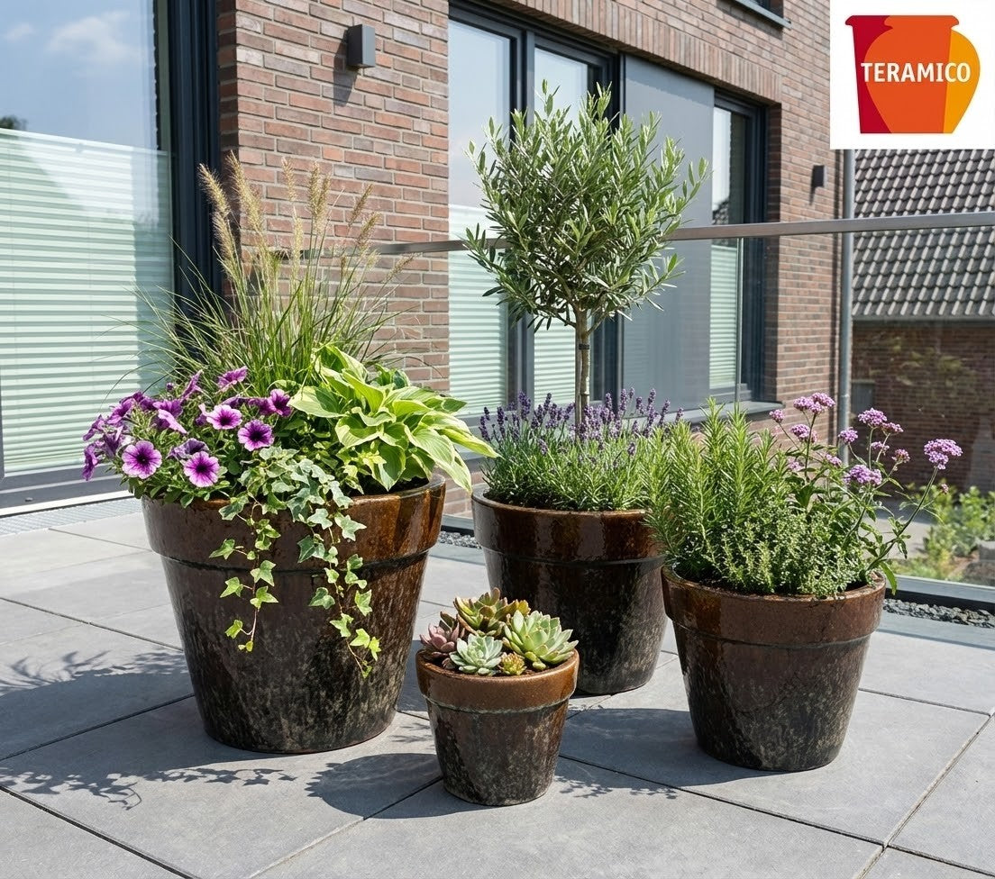 👉 Wir empfehlen: Eine Schicht Blähton als Drainage unten in den Topf, darüber ein Gartenvlies und dann die Erde. Im Winter helfen Keramik-Füße, den Topf vom kalten Boden zu entkoppeln.