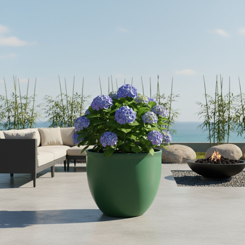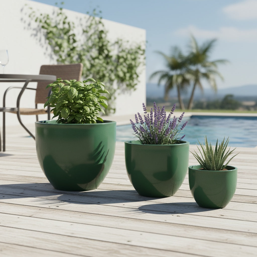 Das beeindruckende Highlight: Der "Egg Pot" in XXL mit 48 cm Durchmesser ist geschaffen für große Solitärpflanzen. Durch die bauchige Form bietet er ein enormes Erdvolumen, was das Wurzelwachstum begünstigt. Die Farbe Grün wirkt in dieser Größe besonders natürlich und macht Ihren Garten zur grünen Oase.