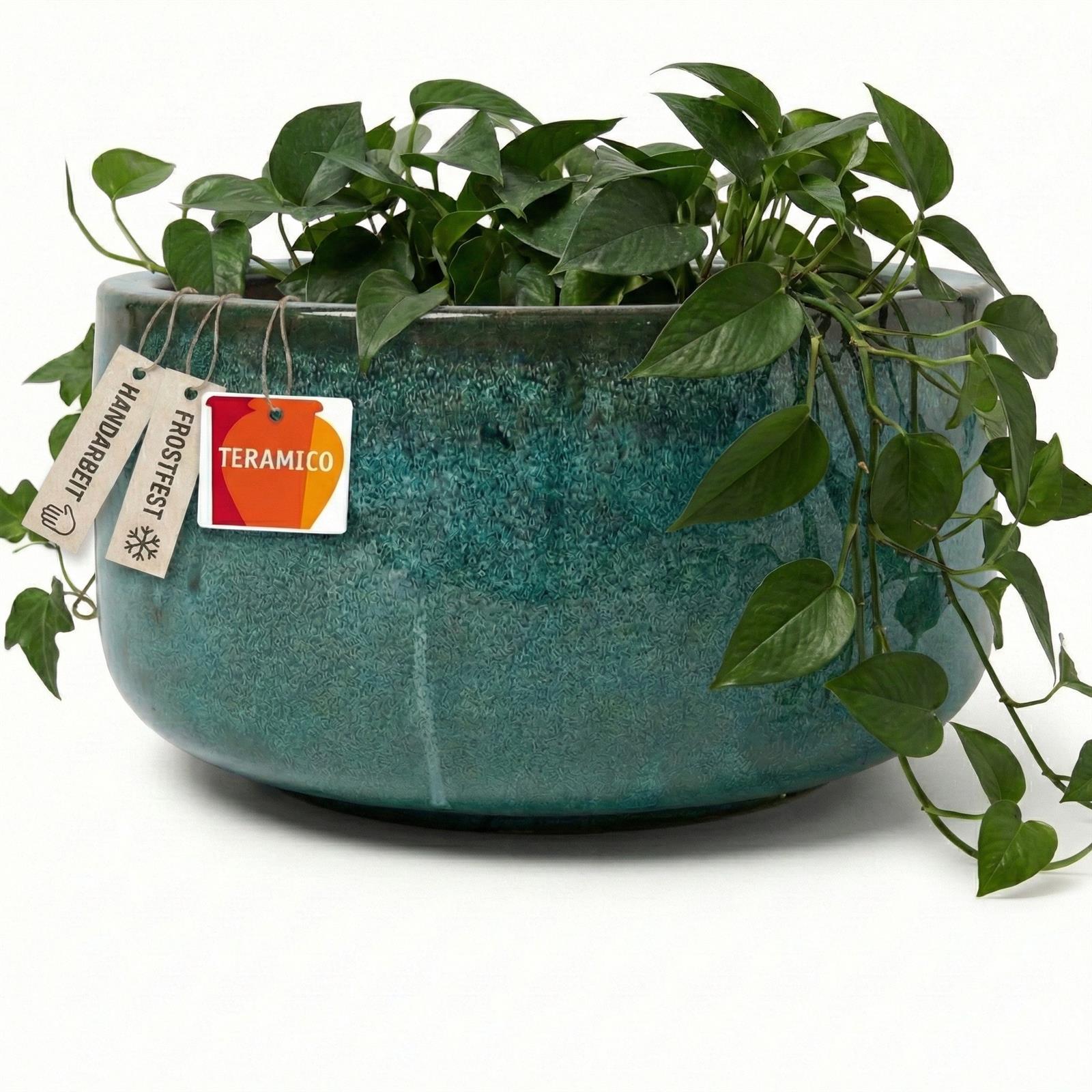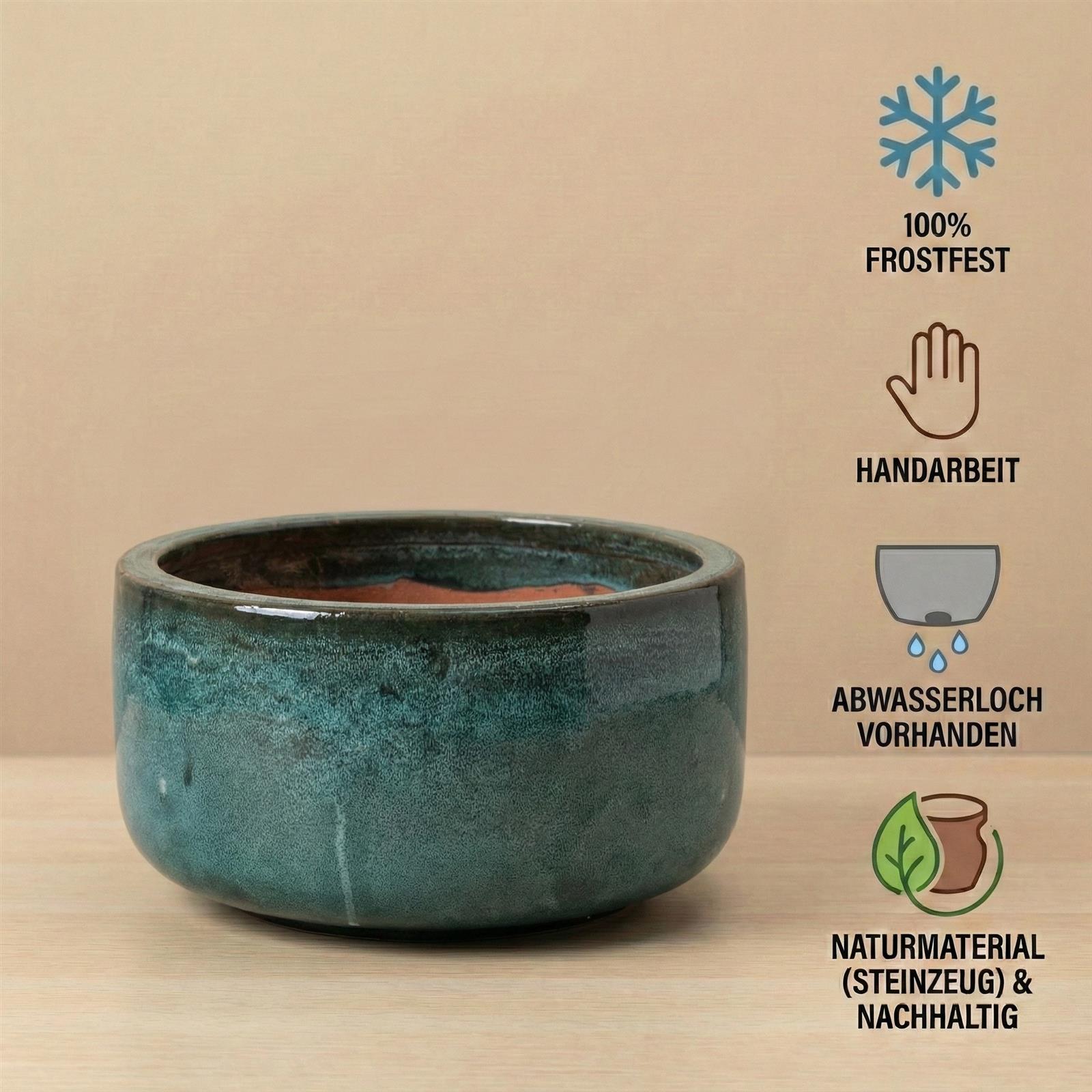 Durch die weite Öffnung und die flache Bauweise eignet sich diese Schale hervorragend für flach wurzelnde Pflanzen wie Sukkulenten, Bonsais oder bunte Saisonblüher (z.B. weiße Heide oder rote Beeren im Winter). Das massive Steinzeug sorgt dafür, dass die Erde lange feucht bleibt und die Wurzeln vor Temperaturschwankungen geschützt sind.