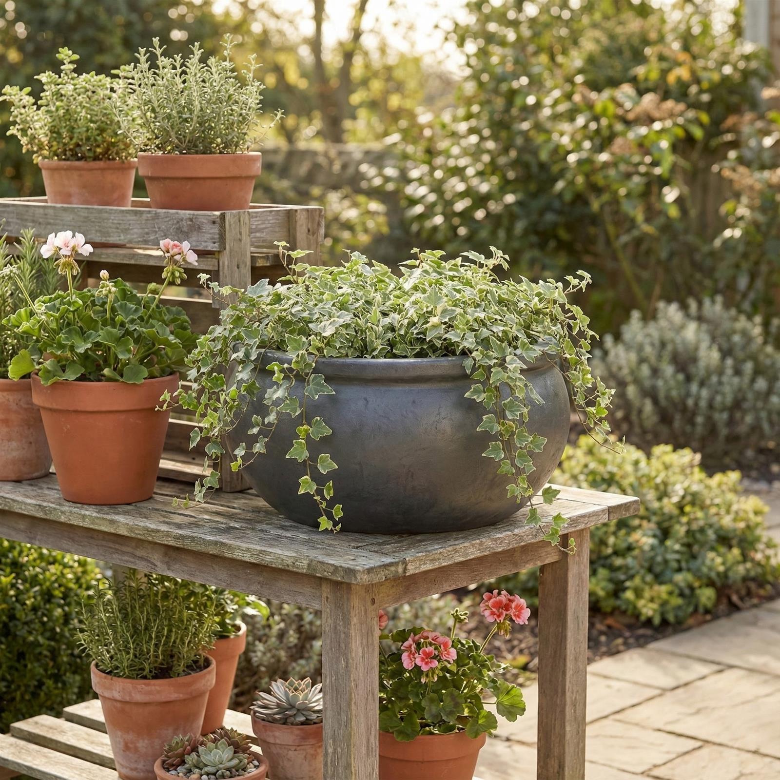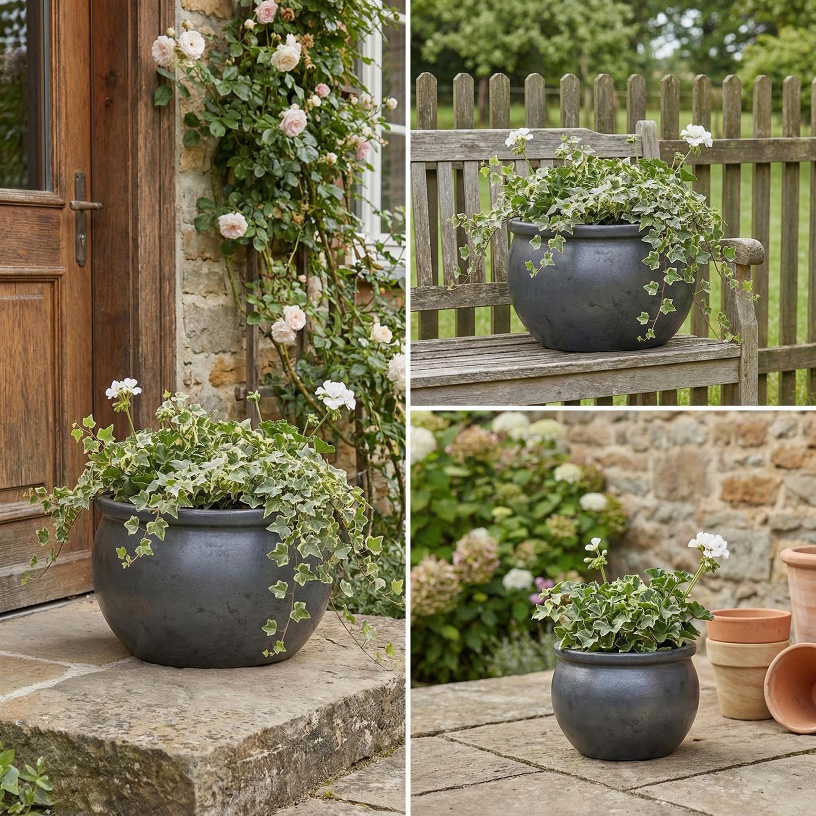 Ideal für Tische, schmale Fensterbänke oder als kleiner Akzent auf Mauervorsprüngen. Bepflanzt mit weißen Alpenveilchen oder Hauswurz wirkt das dunkle Anthrazit besonders edel.