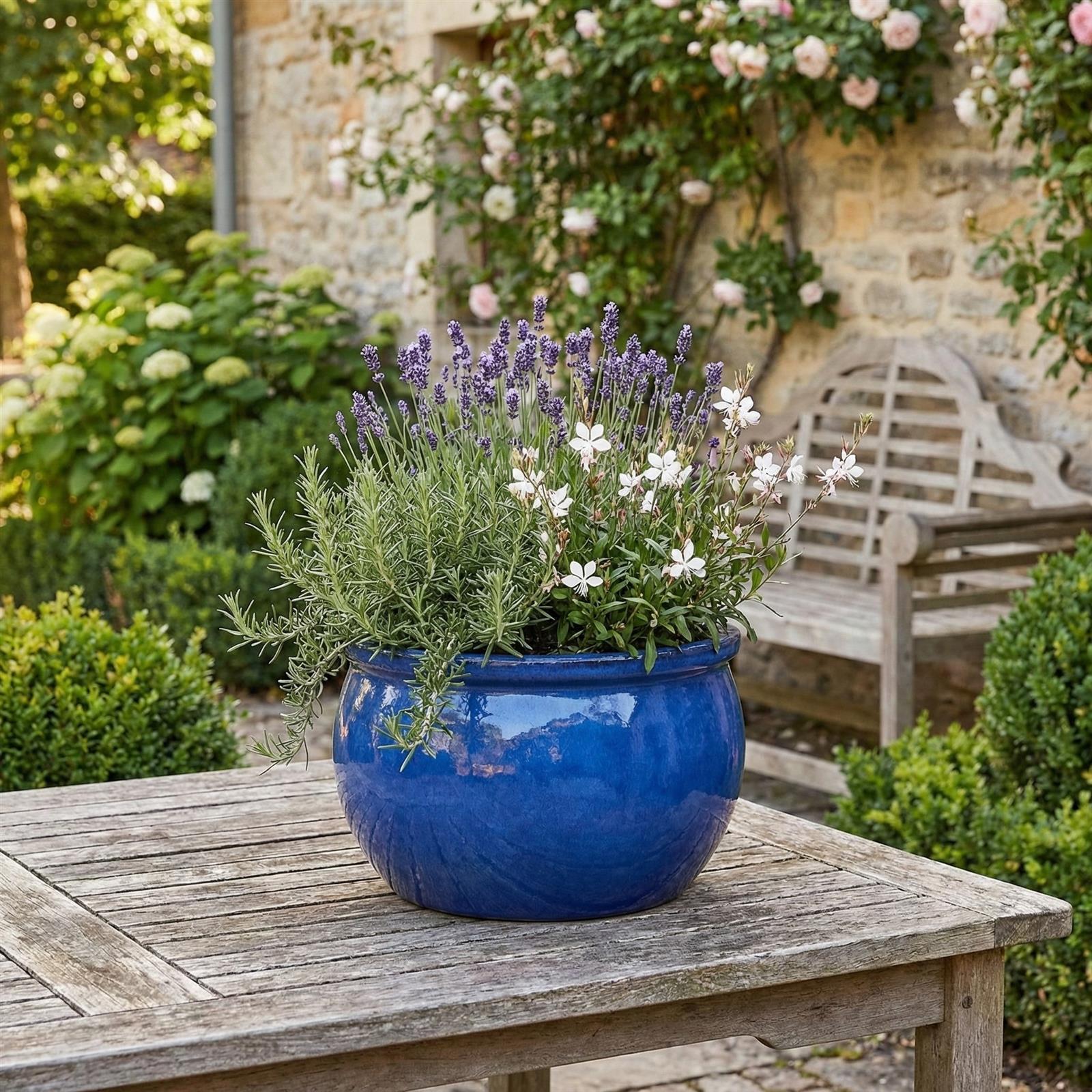 Die idealen Größen für die Dekoration auf dem Gartentisch, der Fensterbank oder auf Mauervorsprüngen. Perfekt geeignet für Küchenkräuter, kleine Sommerblüher oder Stiefmütterchen. Das dunkle Blau wirkt sehr edel als Kontrast zu weißen oder gelben Blüten.